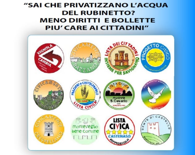 l’acqua”. Alla luce di tali osservazioni chiediamo alle nostre Amministrazioni Comunali che inseriscano nello Statuto Comunale il principio inderogabile che l’acqua è un diritto, un bene comune e non una merce, e che pertanto: