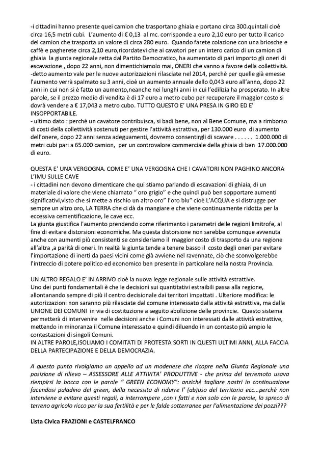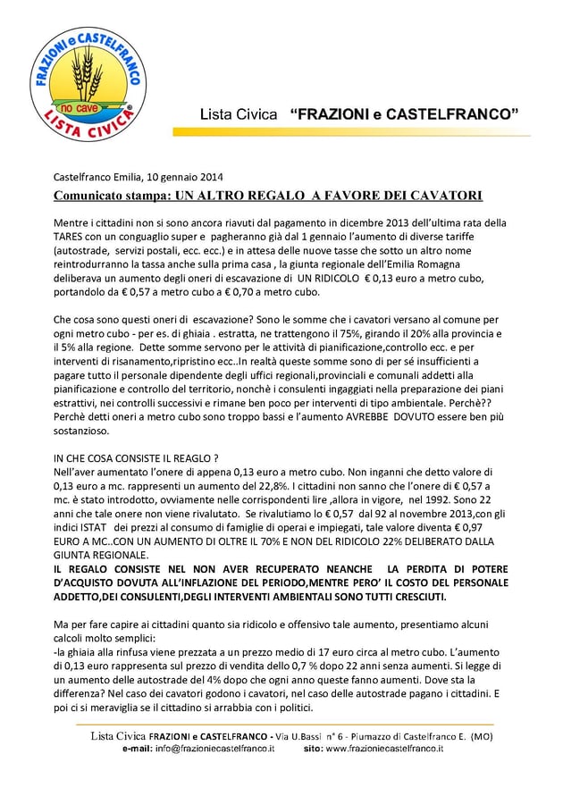 18. gennaio 2014 Lista Civica Frazioni e Catelfrano: oneri di cava ridicoli... Oneri di scavazione Rincari ridicoli, pari a un caffè brioches il comunicato della Lista Civica Frazioni e Castelfranco alla Reggione tagPlaceholderTag: Scrivi commento Commenti: 0
