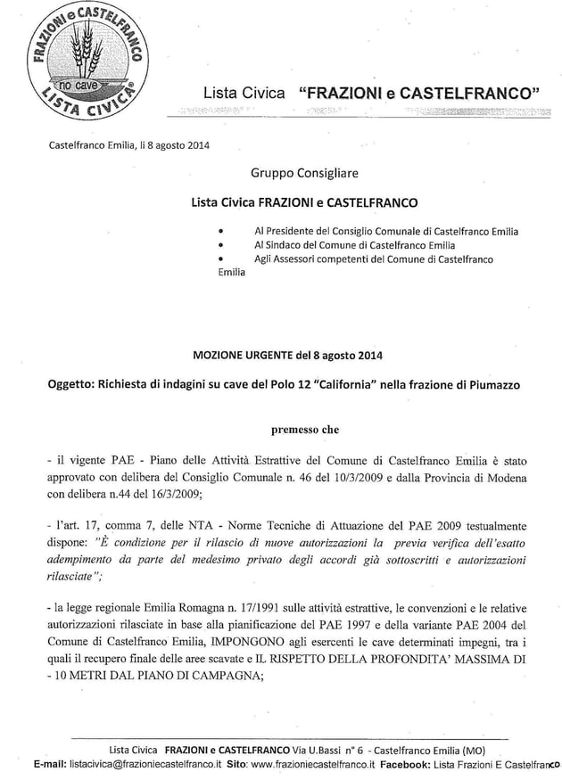 14. agosto 2014 MOZIONE URGENTE 8 AGOSTO RICHIESTA DEI CAROTAGGI NELLE VECCHIE CAVE... tagPlaceholderTag: Scrivi commento Commenti: 0