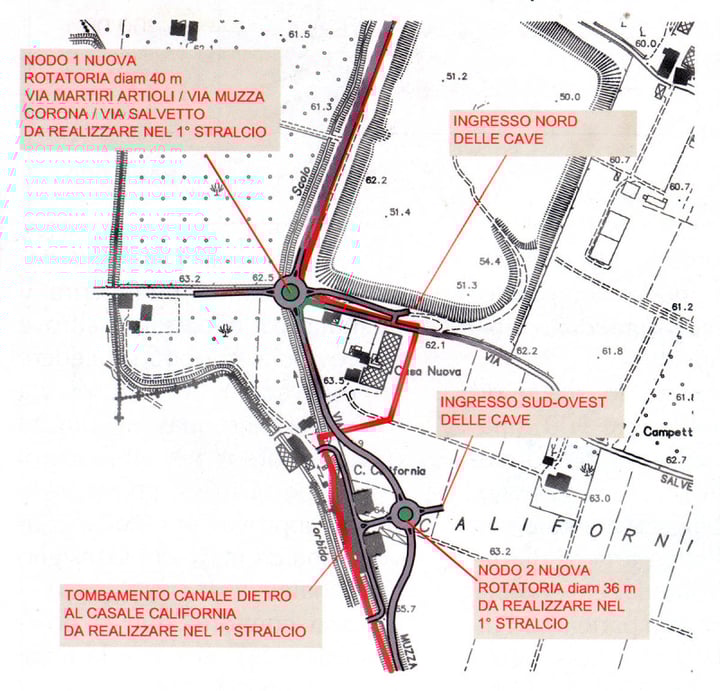 La nuova tangenziale California, riportata qui a seguito, considerata opera compensativa ad onere dei cavatori, sarà sicuramente lo strumento piu efficace per rendere più fruibile l'entrata e l'uscita dalle cave, naturalmente sempre a vantaggio di chi scava......Tale opera dovra essere realizzata prima di iniziare a scavare nelle nuove aree di cava quelle di colore giallo.
