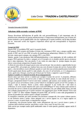 .........Stasera discutiamo dell'adozione di quello che sarà presumibilmente il più importante atto di pianificazione urbanistica di questa amministrazione e l'importanza dell'argomento, per il futuro del nostro territorio e per la qualità della vita che vogliamo per il nostro territorio, mi ha fatto decidere per un intervento scritto che leggerò e depositerò altresì agli atti consegnandolo al Segretario Generale.........